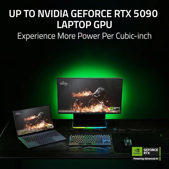 • MORE POWER PER CUBIC‑INCH: Up to NVIDIA GeForce RTX 5090 Laptop GPU Packing surreal power in its ultra-thin form, the Blade 16 features up to an NVIDIA GeForce RTX 5090 Laptop GPU​, pushing up to 160W TGP with Dynamic Boost, to give you more power per cubic-in than any other 16-inch gaming laptop3. Combining raw power with the latest AI enhancements, get more high-quality frames while gaming, richer and more realistically lit worlds while creating, and faster 3D rendering while designing.